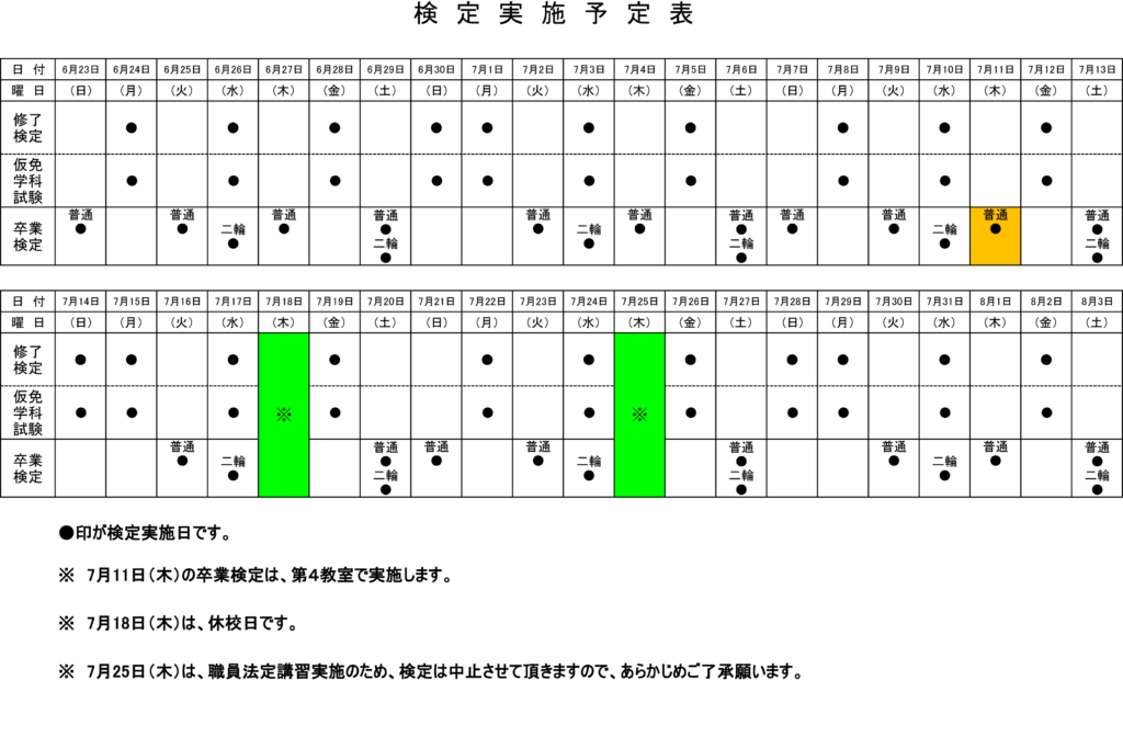8月3日までの検定実施予定表|明るい・楽しい・わかりやすい教習所 八尾自動車教習所