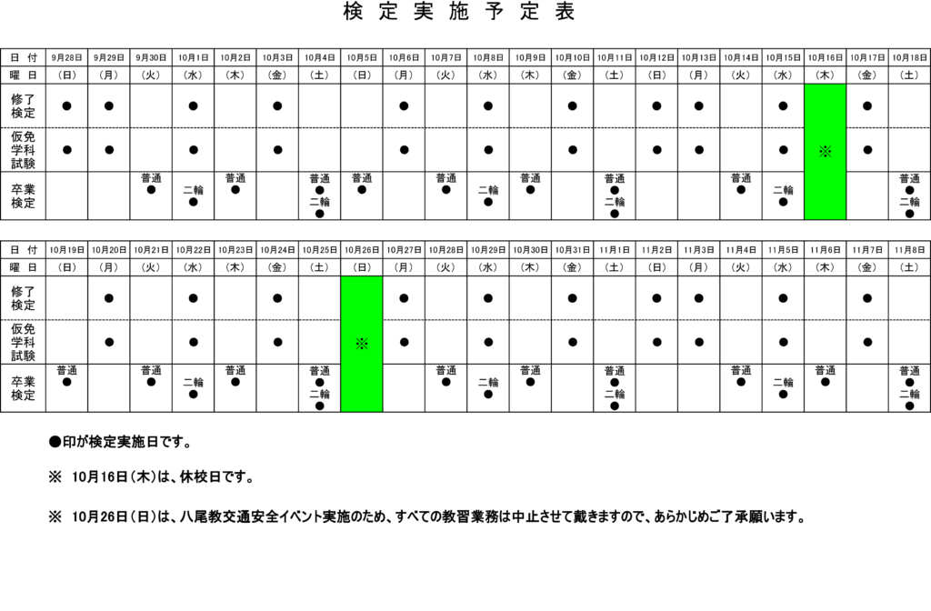 11月8日までの検定実施予定表|明るい・楽しい・わかりやすい教習所 八尾自動車教習所