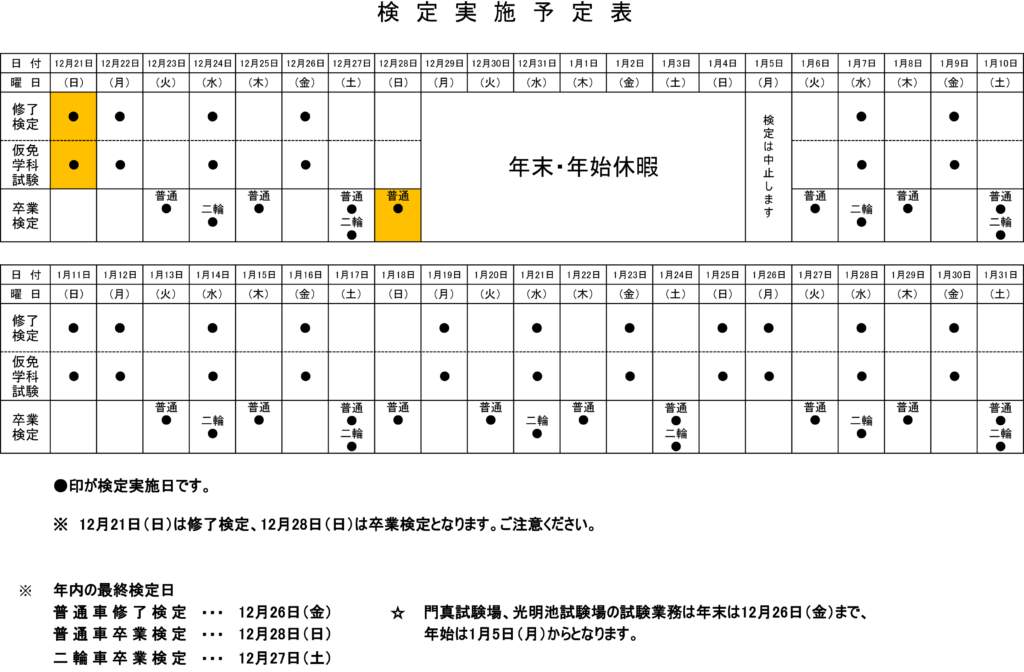 1月31日までの検定実施予定表|明るい・楽しい・わかりやすい教習所 八尾自動車教習所