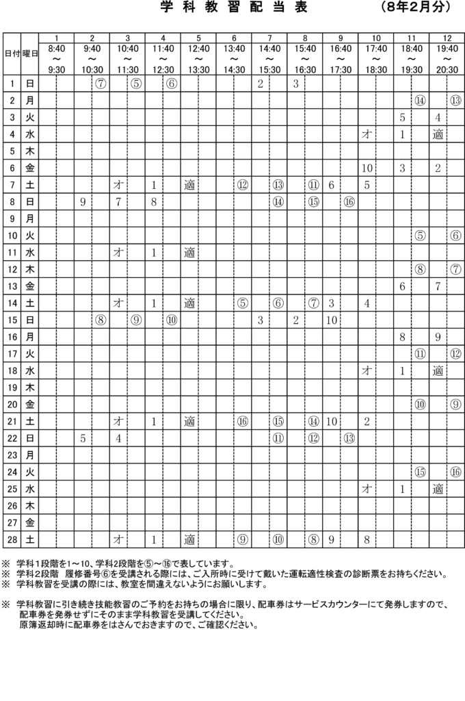 2026年 2月 学科配当表|明るい・楽しい・わかりやすい教習所 八尾自動車教習所